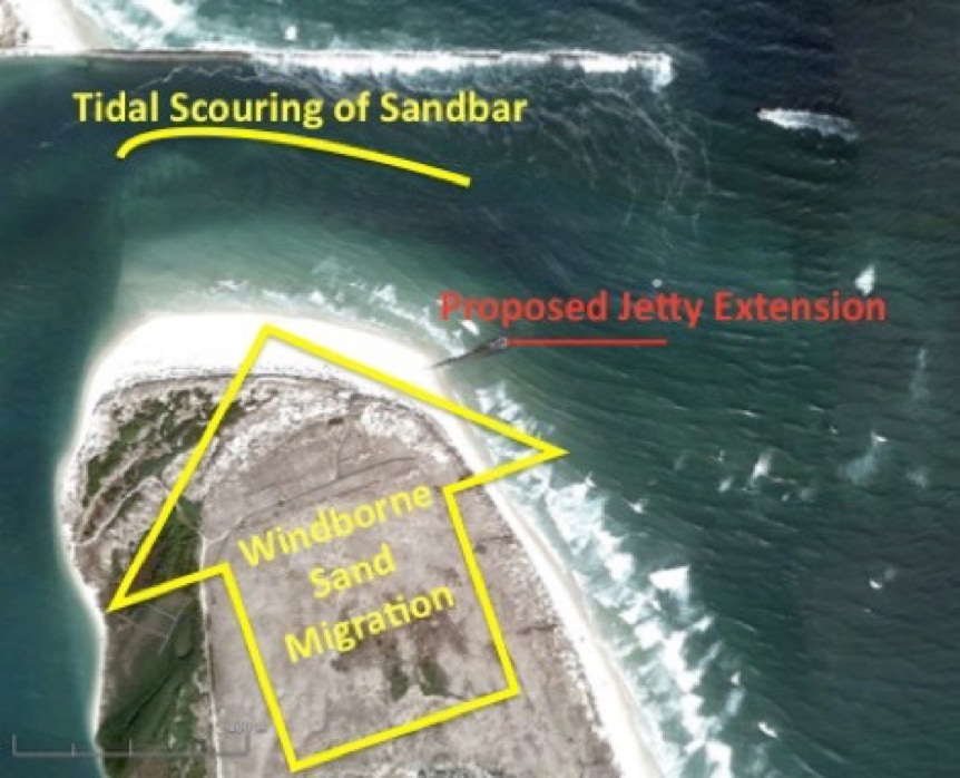 In the absence of tidal currents, the northwestward windborne sand migration would eventually close off the Inlet.  In the absence of this sand migration, the tidal currents would maintain a wide and safe channel.  With both processes at work, a balance is maintained, with the sand transported into the sandbar by the winds balanced by the sand scoured away from the bar by the tidal currents.  If the northwestward windborne sand migration increases over a long period of time, the sandbar encroaches farther into the Inlet.  This narrows the channel, which causes the speed of the tidal currents in the channel and their resulting scouring effect to increase until the northward encroachment of the sandbar is halted and balance is reestablished.  If the northwestward windborne sand migration decreases, the opposite effects occur until the balance is again reestablished.  Sand is continually replenished in the Smyrna Dunes Park source region through the normal process of building dunes from sand washed ashore on beaches, with some of the sand scoured from the sandbar in the inlet eventually finding its way back into the park to complete a full cycle in this very dynamic environment.  I think this simple description captures the key forces at play in the Inlet and clearly shows that extension of the south jetty would not have the desired effect.
